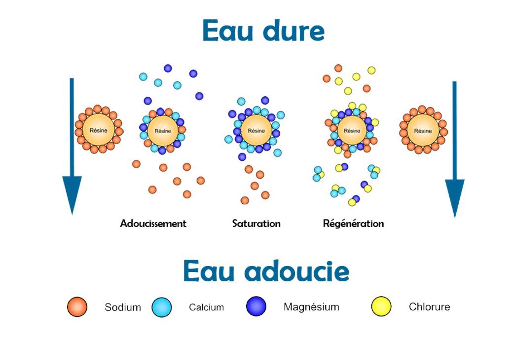 Un adoucisseur d’eau fonctionne sur le principe de la captation des ions calcium (Ca2+) et des ions magnésium (Mg2+,) responsables de la présence du tartre dans les installations. L’eau qui passe par le bac de résine est débarrassée des ions calcium et magnésium qui sont remplacés par des ions sodium (Na+).