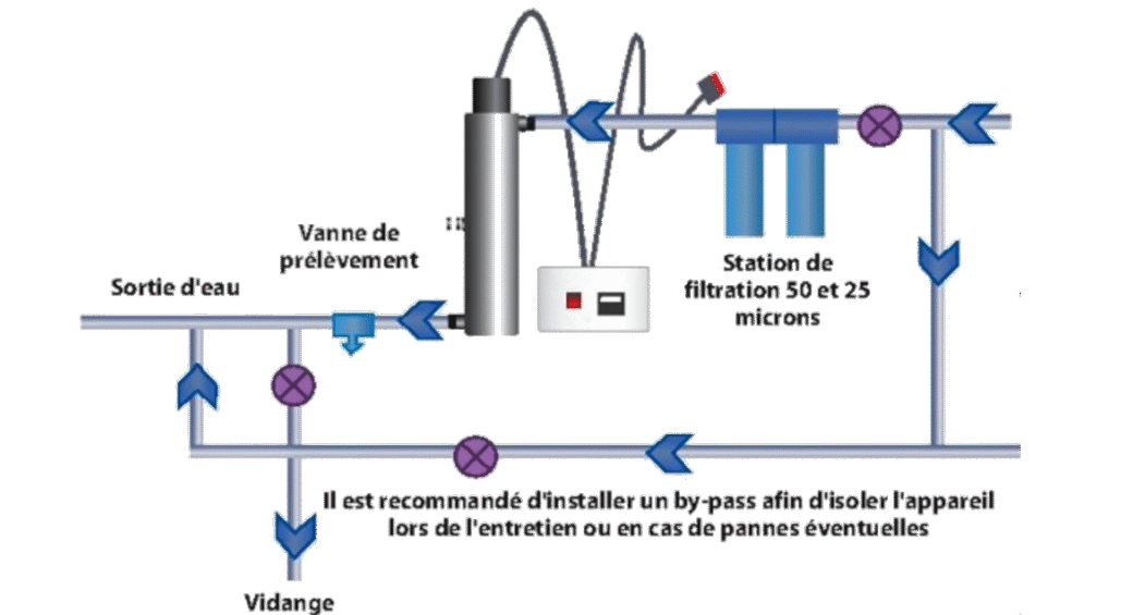Dans les approvisionnements d’eau prives, le système UV est le dernier maillon du système de traitement après la pompe, le système de filtration et le stockage. Un filtre a sédiments est généralement place juste avant le systeme UV.